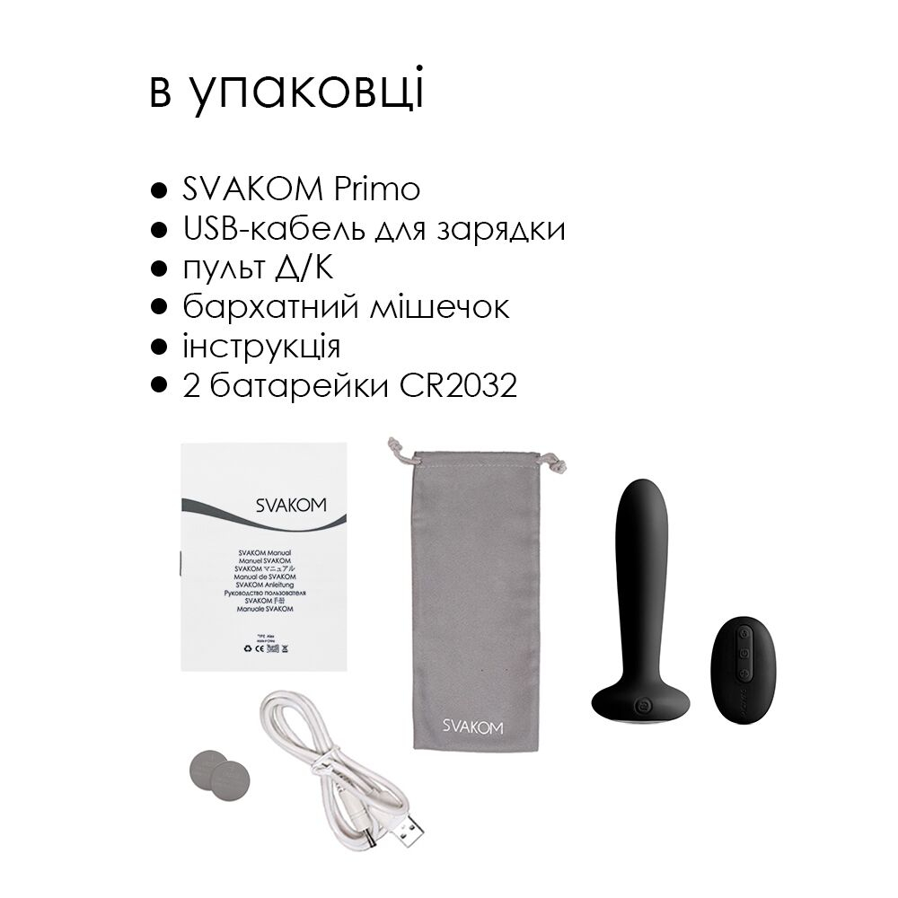 В упаковці: SVAKOM Primo + пульт Д/У + оксамитовий мішечок + інструкція + кабель USB для зарядки + 2 батарейки CR2032.
