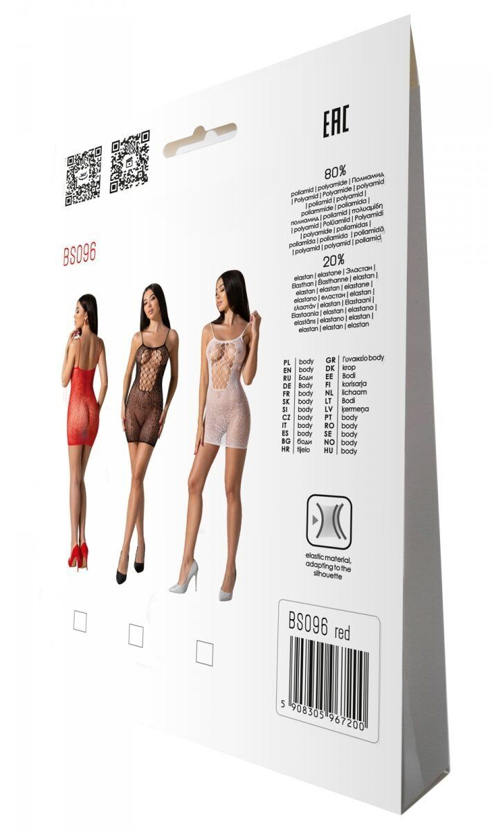 Ажурна мінісукня Passion BS096 — дуже гарний і вишуканий елемент еротичного гардероба. Ніжна напівпрозора мінісукня гарно облягає фігуру та підкреслює її граціозність. Завдяки тонким бретелям лінія ключиць і шия відкриті для пристрасних поцілунків, а плетіння з тонких ниток, що трохи оголює частину грудей і животик, створює дуже хвилювальний акцент і привертає захоплений погляд. Завдяки еластичності тканини можна трохи варіювати довжину виробу й за бажанням підтягнути сукню вище і злегка оголити попку.