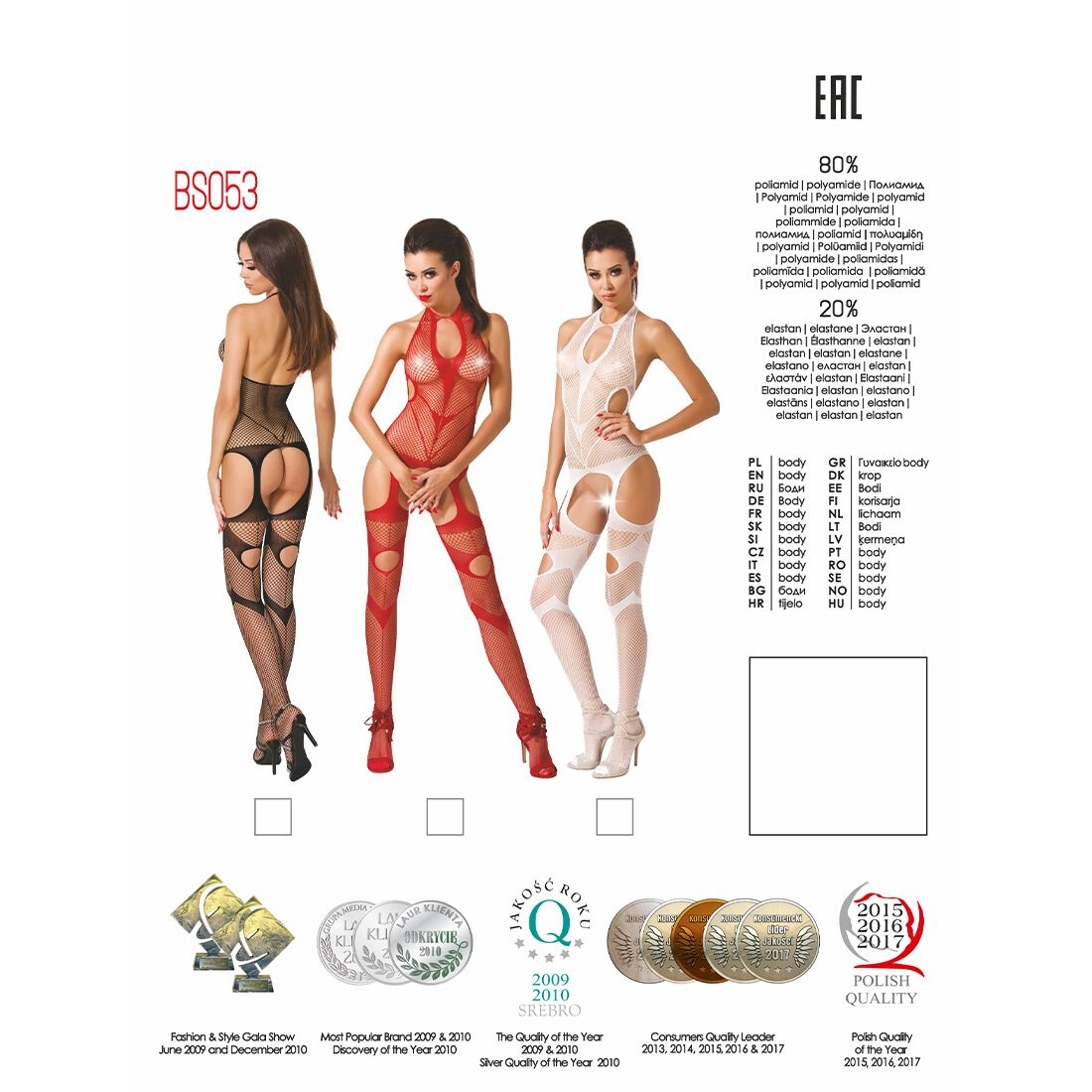 Пропонуємо купити bodystocking Passion BS053 - незамінний атрибут для пристрасної ночі. Незвичайний і в той же час лаконічний дизайн цієї моделі, підкреслить красу вашого тіла. Глибоке декольте акцентує увагу на грудях, а відкриті ділянки і геометричний малюнок, візуально роблять фігуру стрункішою. Високі панчохи в дрібну сітку з імітацією шва, щільно облягають ніжки. М'який матеріал бодістокінга відмінно тягнеться, тому виріб буде однаково добре виглядати як на худенькій, так і на пишній дівчині. Бодістокінг додасть вашому образу відвертості і еротичності.