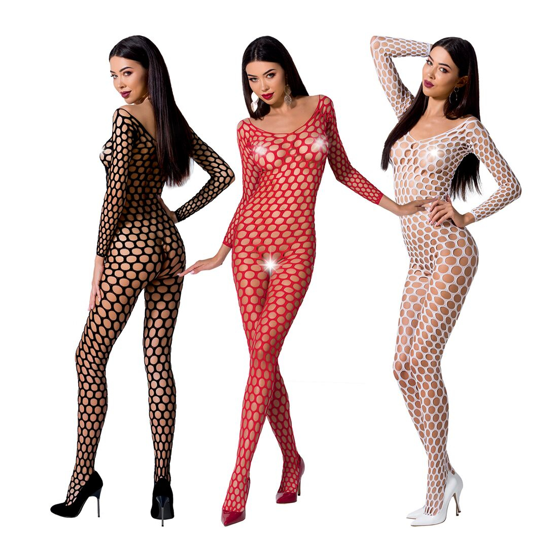 Одночасно одягнена і оголена - не фантазія, а реальність! Потрібно тільки купити бодістокінг з крупною сіткою Passion BS077: який закриває все тіло, він одночасно залишає простір для фантазії і - доступ до самих інтимних зон!