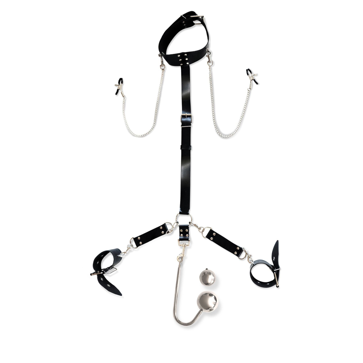 Цей девайс — для гарячих БДСМ-практик для тих, хто не знає меж в отриманні задоволення. Поєднання натуральної шкіри й міцного, гладенького металу — неймовірний фетиш, який сколихне вашу підсвідомість і проявить найтемніші сексуальні бажання. Шкіряний нашийник з наручниками, металевий анальний гак та затискачі для сосків — це не просто звичайна гра з елементами домінування та підкорення. Це девайс, який змусить вашого партнера/партнерку забути про все й лише відчувати біль та задоволення кожною клітиною тіла.