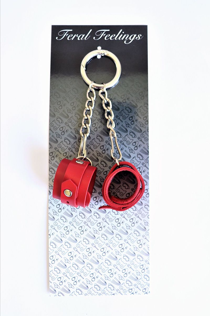 Міні-наручники з натуральної шкіри рослинного дублення, прикрашені хольнітенамі (заклепками). Кожен наручник кріпиться до основного кільця-карабіну ланцюжком і міні-карабіном, тому можна носити тільки один наручник, а другий - подарувати своєму партнеру у якості символу.
