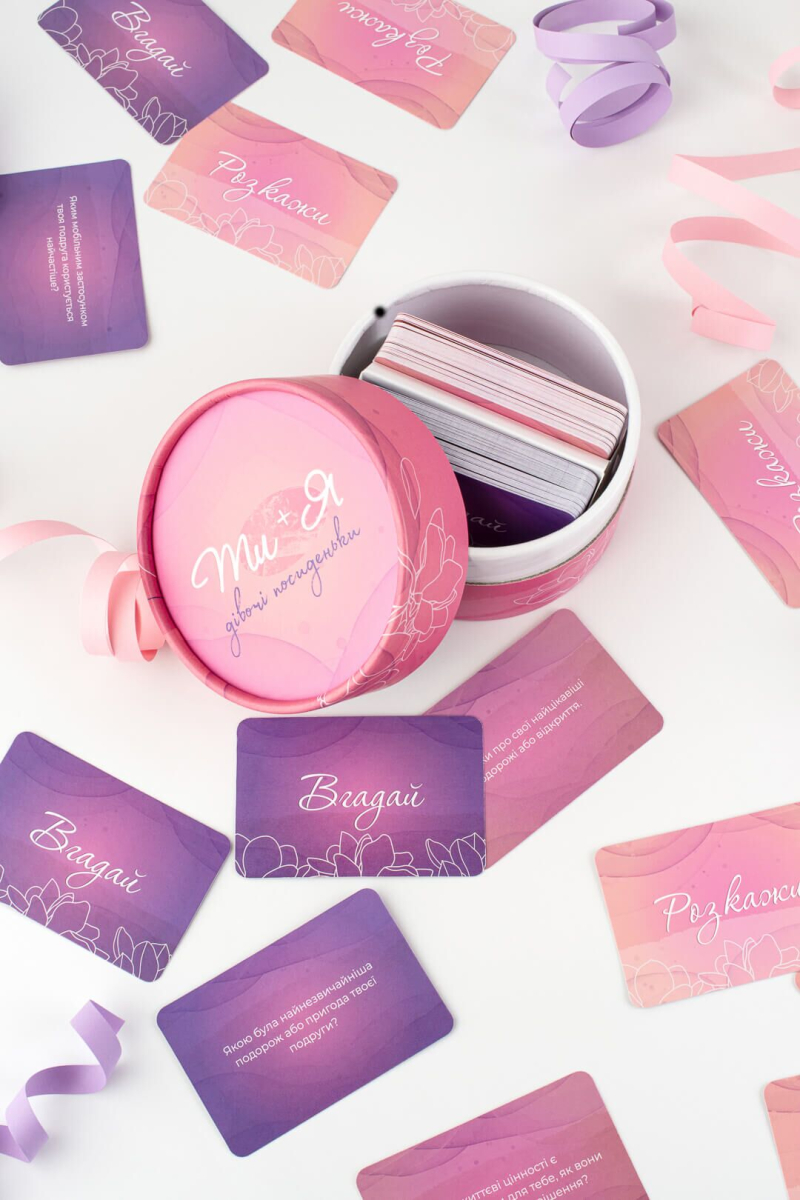 Опис: «ТИ + Я: Дівочі посиденьки» — гра, що розкриє нові грані кожної із дівчат та додасть емоційності вашим зустрічам! Доповніть ваші посиденьки цікавими та важливими темами, теплими спогадами та відвертими розмовами. Ваші зустрічі стануть ще більш наповненими з нашою грою!