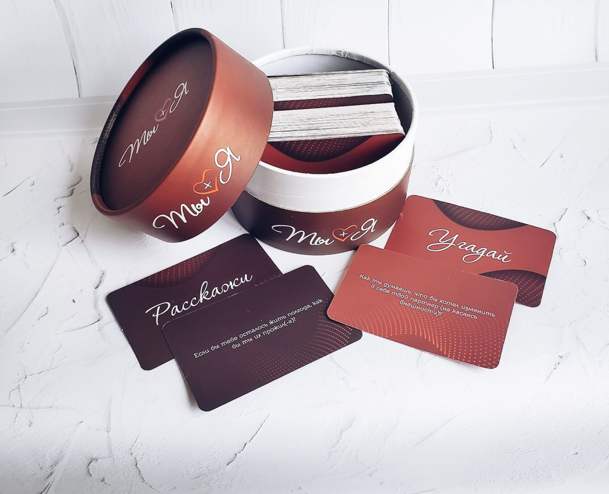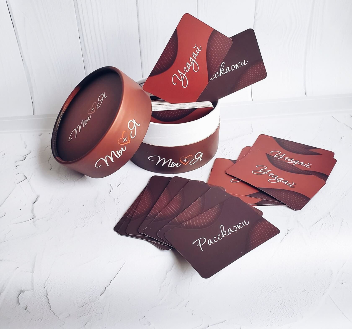Стисло про правила: Тягніть картки з різних колод і за чергою відповідайте на запитання. Витягли картку «Розкажи» — відповідаєте на запитання, яке стосується вас. Дісталася картка «Вгадай» — намагаєтеся правильно відповісти про вашого партнера.