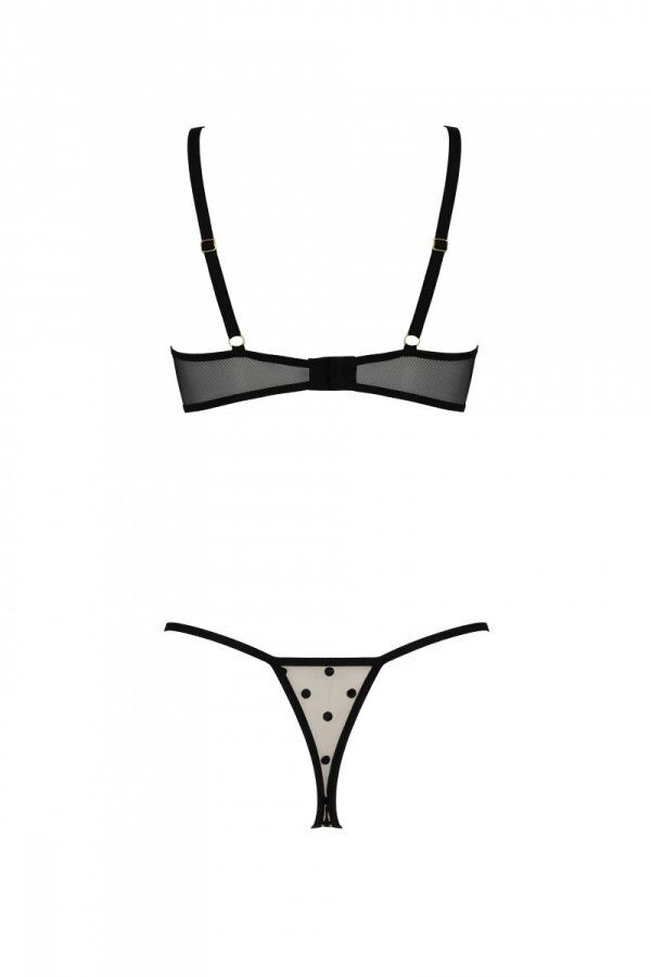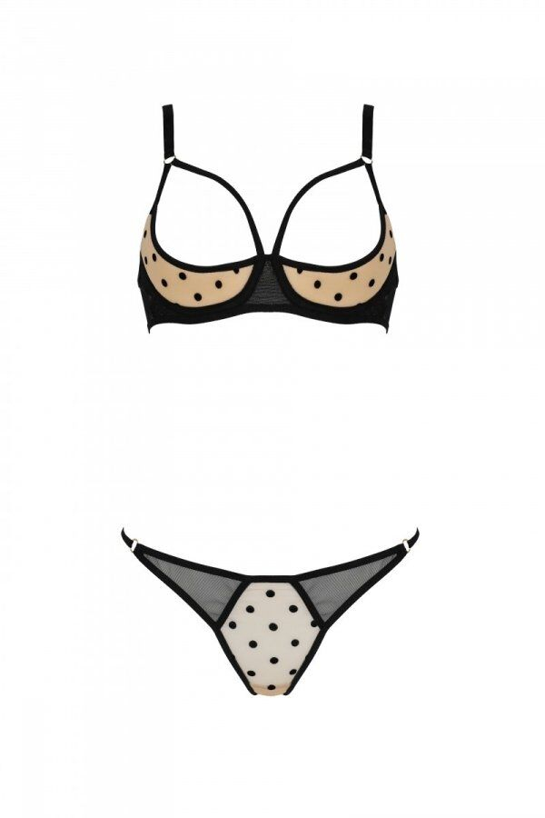 Еротичний комплект Passion MARINA SET WITH OPEN BRA складається з бра та стрінгів, виготовлених із м’якої сіточки комбінованих чорного та бежевого в горошок кольорів. Бігунками можна відрегулювати довжину бретелей, щоб носіння дивовижного комплекту було максимально комфортним. Маленькі стрінги, що йдуть у комплекті, доповнюють відвертий образ.