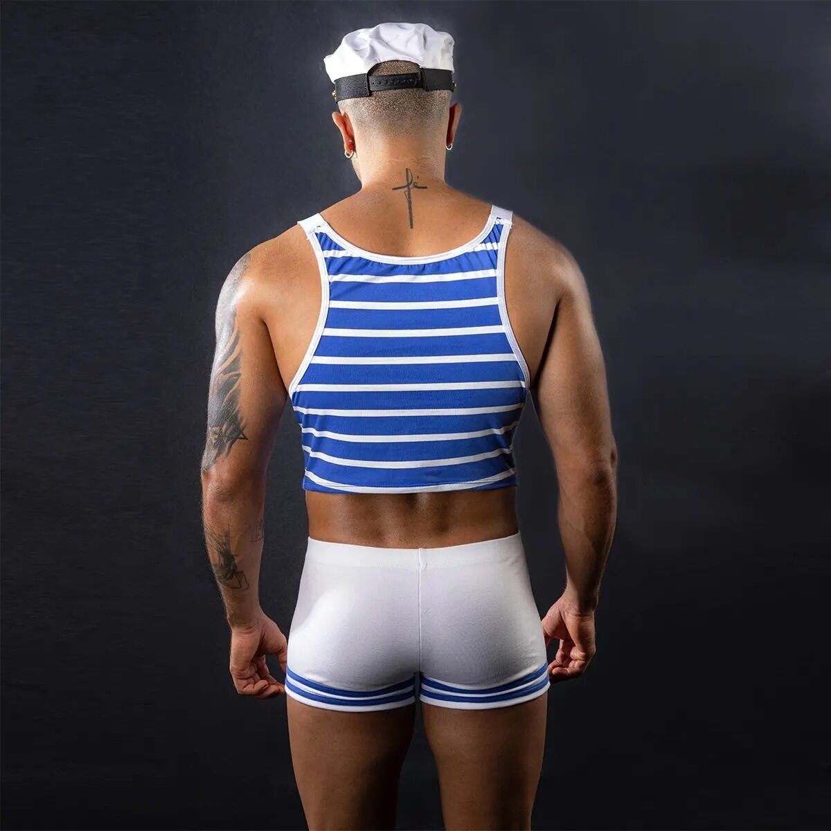 Костюм моряка пошитий із біло-блакитного матеріалу. Блакитний топ у білу смужку на широких лямках має приголомшливий вигляд завдяки двом ґудзикам, на які можна причепити лямки за прикладом комбінезона. Регулювати довжину топа можна широкими повзунками. Короткі білі шорти з двома смугами по низу й чотирма ґудзиками спереду мають дуже стильний і розбурханий вигляд: м’який матеріал обтягує апетитну попку та ніжні місця, привертаючи погляд. Біла кепка із чорним козирком доповнює образ.