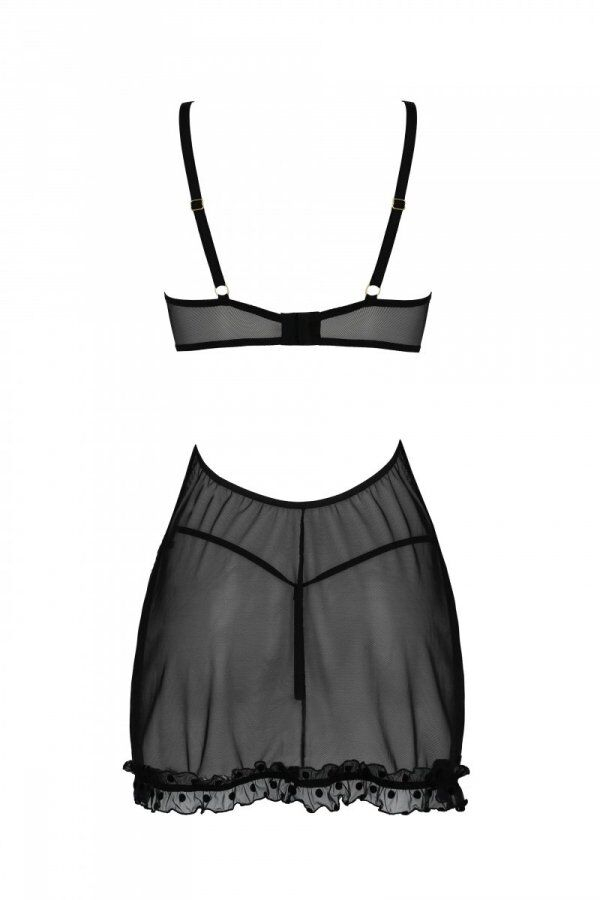 Дрібна м’яка сіточка не приховує фігуру, а лише чарівно прикриває животик та попку. Акценти на дрібних чашках бра й рюшах на подолі пеньюара мають приголомшливий вигляд. Щоб еротичний пеньюар Passion MARINA CHEMISE сидів ідеально, повзунками можна відрегулювати довжину лямок. Ліф зручно застібається на спинці. У комплекті є маленькі стрінги.