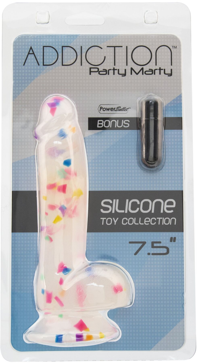 Настав час для вечірки! Хочете розважитися і порадувати партнера — тоді потрібно купити фалоімітатор з конфетті ADDICTION - PARTY MARTY - 7.5" - FROST & CONFETTI. Це неймовірно приваблива модель з матового силікону, з дійсно міцною присоскою і сумісна із більшістю ременів для страпона. Преміальний силікон дуже пружний, ніжний і фантастичний на дотик. Вібропуля для додаткових ігор в комплекті!
