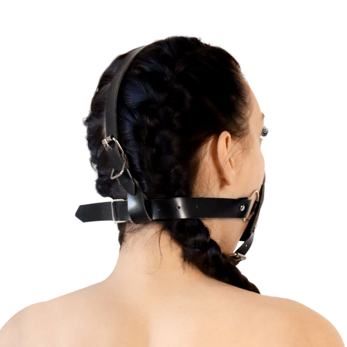 Нашийник виготовлений із натуральної шкіри високої якості з додаванням металевої фурнітури. За допомогою металевих кілець, нашийник застібається не тільки на шиї, а й проходить через голову, для більш сильної фіксації. Широка полоска шкіри надійно закриває рота, що лише укріплює позицію раба, адже він більше не здатен розпоряджатися собою.