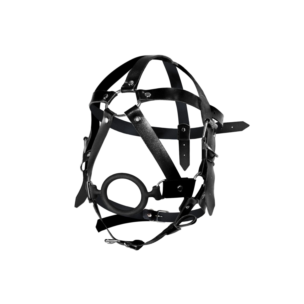 Маска у вигляді ременів щільно прилягає до голови і обличчя. Виготовлена з натуральної шкіри, вона міцна, надійна і комфортна. Оснащена можливістю регулювати ремені, для того щоб забезпечити комфортну посадку. Силіконовий кляп у вигляді кільця тримає рота відкритим протягом всієї гри, створюючи відчуття беззахисності та покірності.