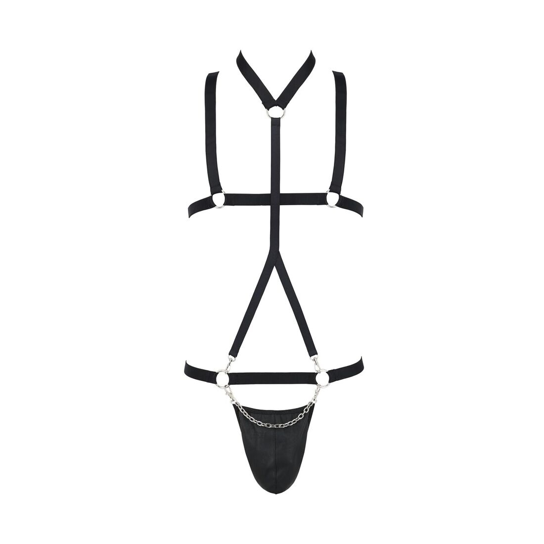 Комплект чоловічої білизни зі стреп Passion Set Andrew пошитий із м’якої екошкіри. Плечові ремені-резинки та чокер доповнені металевими кільцями та карабінами. Стринги прикрашені спереду ланцюжком і зроблені таким чином, що за потреби їх можна відстебнути, оголивши найцікавішу частину тіла. Ззаду стринги наполовину прикривають сідниці.