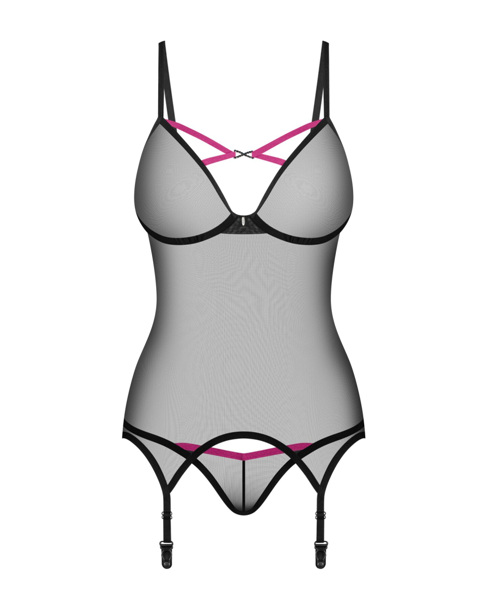 Задумали ефектно постати перед обранцем, і так, щоб у нього відвисла щелепа? Для цього вам варто купити прозорий корсет Obsessive Novenes corset & thong, доповнений відповідними стрінгами. Одна з яскравих особливостей цього набору — декор із тонких пурпурових стрічок в зоні декольте, на спинці та задній частині трусиків. Ці деталі гармонійно доповнюють основний матеріал — чорну шовковисту мікросітку, оброблену матовим кантом у тон.
