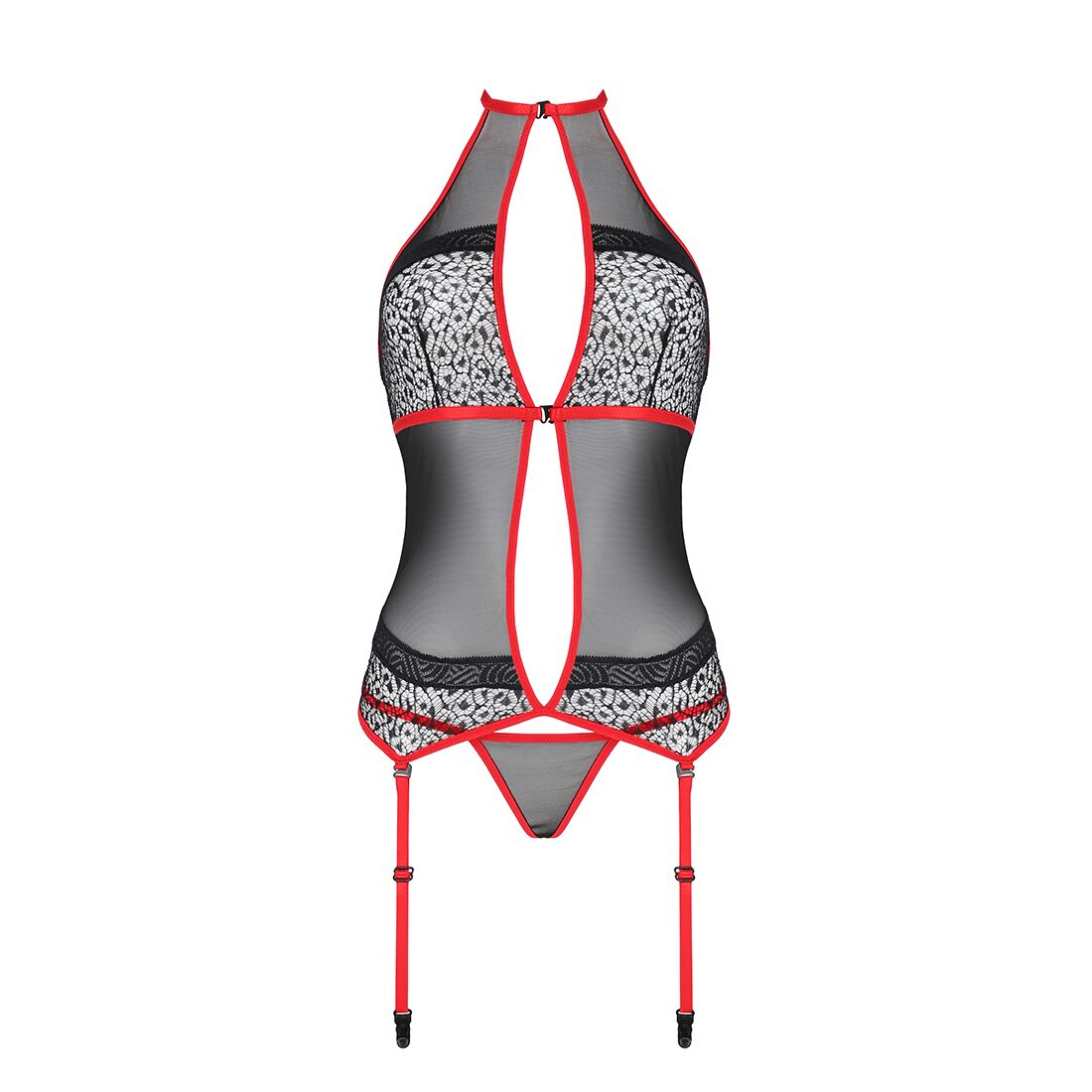 Корсет з пажами виконаний із чорної прозорої тканини та гарного мережива, обшитий червоною облямівкою. Позаду корсет Passion оснащений застібками за всією довжиною спинки, а спереду на шиї та грудях є застібки, які легко розстебнути в процесі бурхливих розваг.