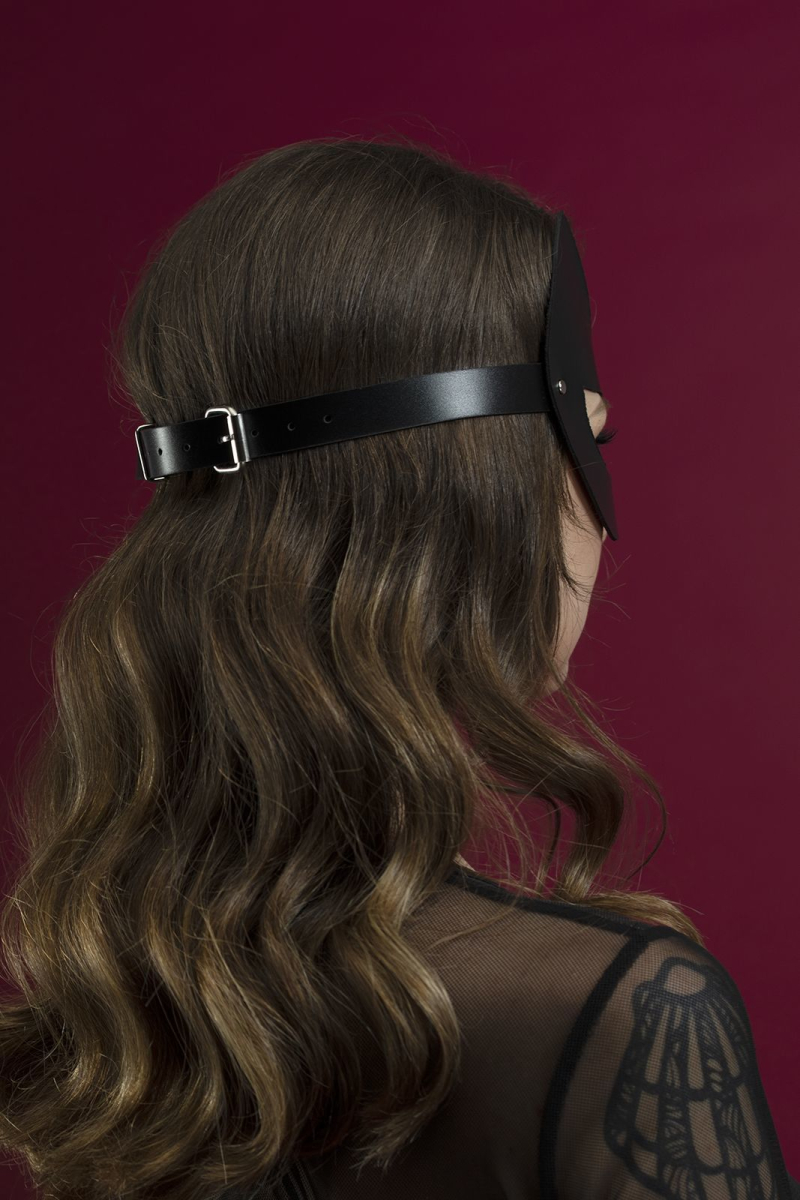 Невелика акуратна маска кішки з маленькими вушками і сріблястою фурнітурою: заклепками і пряжкою. Маска стильно виглядає і м'яко адаптується до лиця будь-якої форми. Виготовлена ??з високоякісної шкіри рослинного дублення.