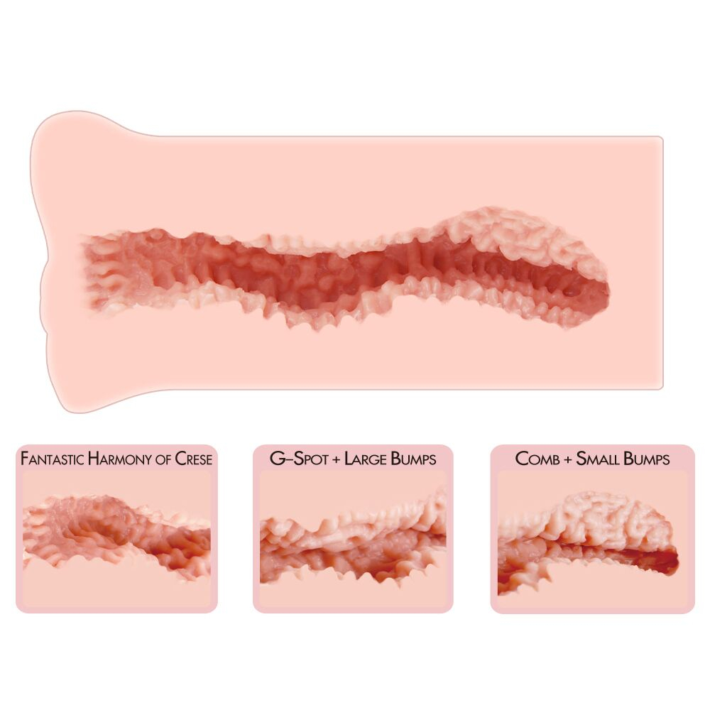 - Ви відчуєте м'які та приємні відчуття, як у справжній вагіні, а вузькі поздовжні ребра, рельєфні кульки та поперечні складки додатково ерегують Ваш пеніс.