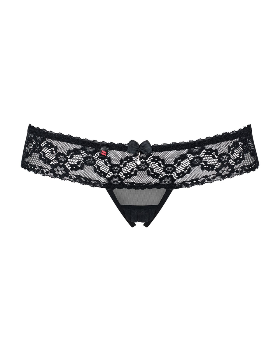 Навіть таку маленьку деталь одягу, як мереживні танги з доступом Obsessive 837-THC-1, дизайнер створив як особливу. Зверніть увагу на м’яке еластичне мереживо з дрібними акуратними квітами, яке широкою ажурною смугою лягає на стегна. А ще — на сіточку, що спокусливо відкриває лобок, і на бахрому трохи нижче, що прикриває спеціальний виріз для безперешкодного доступу до жіночого лону, що манить. Сідниці в трусиках відкриті. На цих чудових танга є навіть міні-прикраси — атласний бантик та камінчик.