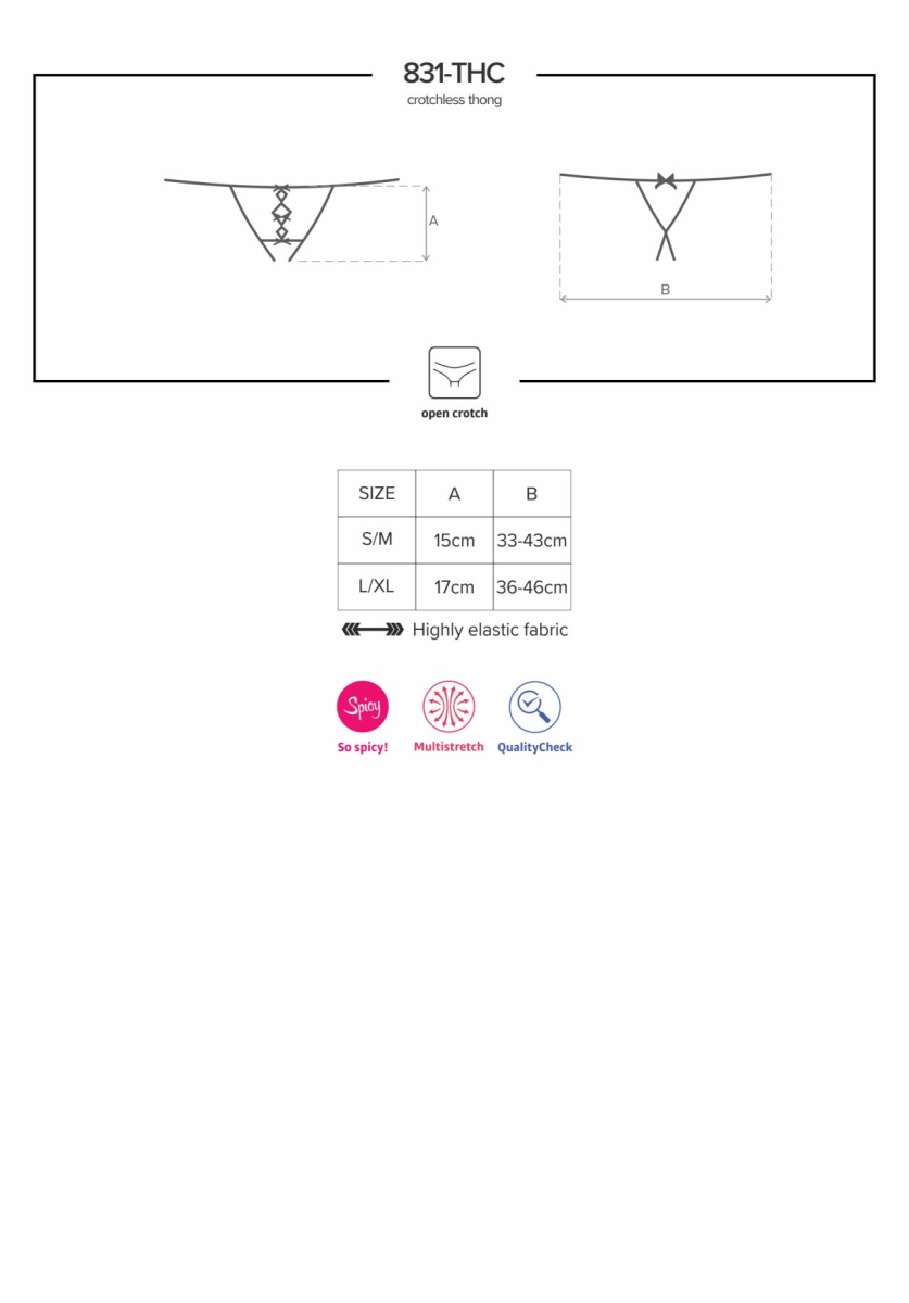 Дивне переплетення тонких еластичних ремінців і невеликого шматочка мережив у результаті дають витончений дизайн сексуального, навіть розпусного аксесуара. Мереживні танги з двома отворами Obsessive 831-THC-1 — це відразу два вирізи та доступ до цікавих, ніжних жіночих містечок. Бантики спереду і ззаду ніби натякають на готовність побешкетувати, я м’які мережива з вигадливим візерунком так і манять погладити.