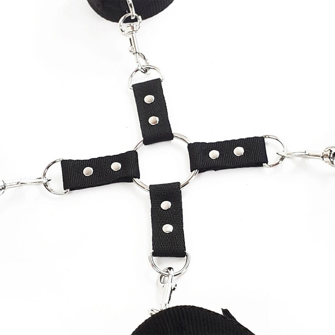Набір являє собою хрестовину з кільця і ??коротких ременів, до яких карабінами пристібаються наручники. Розташуйте партнера на животі, заклавши руки за спину та зігнувши ноги в колінах. Пристебніть усі частини бондажу — насолоджуйтесь абсолютним доступом до тіла та неможливістю другої половинки рухатися та чинити опір.