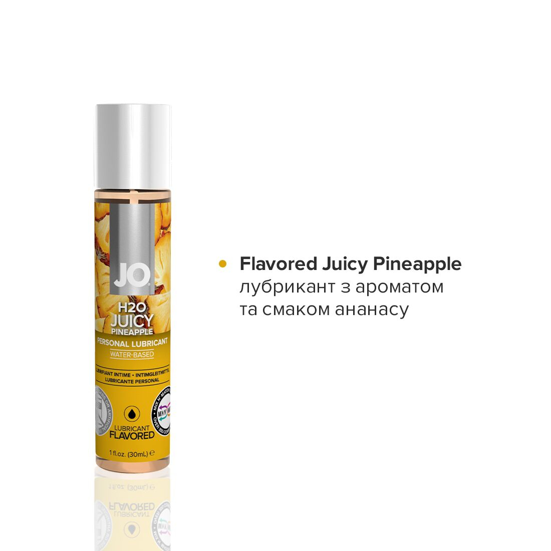 Jo Flavored Juicy Pineapple — pH-нейтральний інтимний лубрикант із насиченим ароматом ананаса. До складу входить гліцерин виключно рослинного походження. Усі інгредієнти найвищої якості та тільки натуральні харчові ароматизатори. У формулі лубриканту не міститься цукру, парабенів та пропіленгліколю. Забезпечує комфортне ніжне ковзання без липкості. Абсолютно безпечний для орального споживання, не має післясмаку.