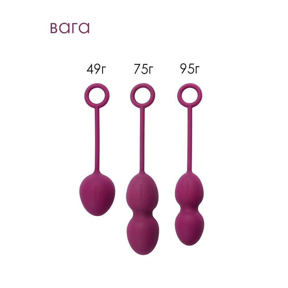 Пропонуємо купити набір вагінальних кульок зі зміщеним центром ваги Svakom Nova Plum Violet – унікальний інтимний аксесуар, який допоможе зміцнити вагінальні м'язи, підвищити пружність стінок піхви, посилити задоволення під час близькості, а також відновитися після пологів. У набір входить три тренажери різного діаметру та маси для прогресивних тренувань. Нестабільний центр тяжкості — кулька, що перекочується всередині, — підвищує ефективність занять і додає приємних відчуттів!