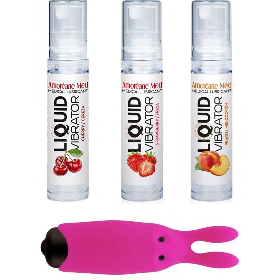 Йди за кроликом - у світ насолод і неймовірних задоволень! Пропонуємо придбати набір з 3-х смаків стимулюючого лубриканта (3х10 мл) і вібропулі Adrien Lastic Pink. Стимулюючий лубрикант Amoreane Med - це природна формула з екстрактами рослин з лісів Амазонки, яка змусить вас тремтіти від задоволення! Ефект вібрації доповнить відчуття в найінтимніші моменти. Вібропуля у вигляді кролика з ніжними силіконовими вушками порадує вас 10 режимами роботи. Використовуйте все разом або окремо - як підкаже фантазія! Набір упакований в стильну косметичку-хамелеон.