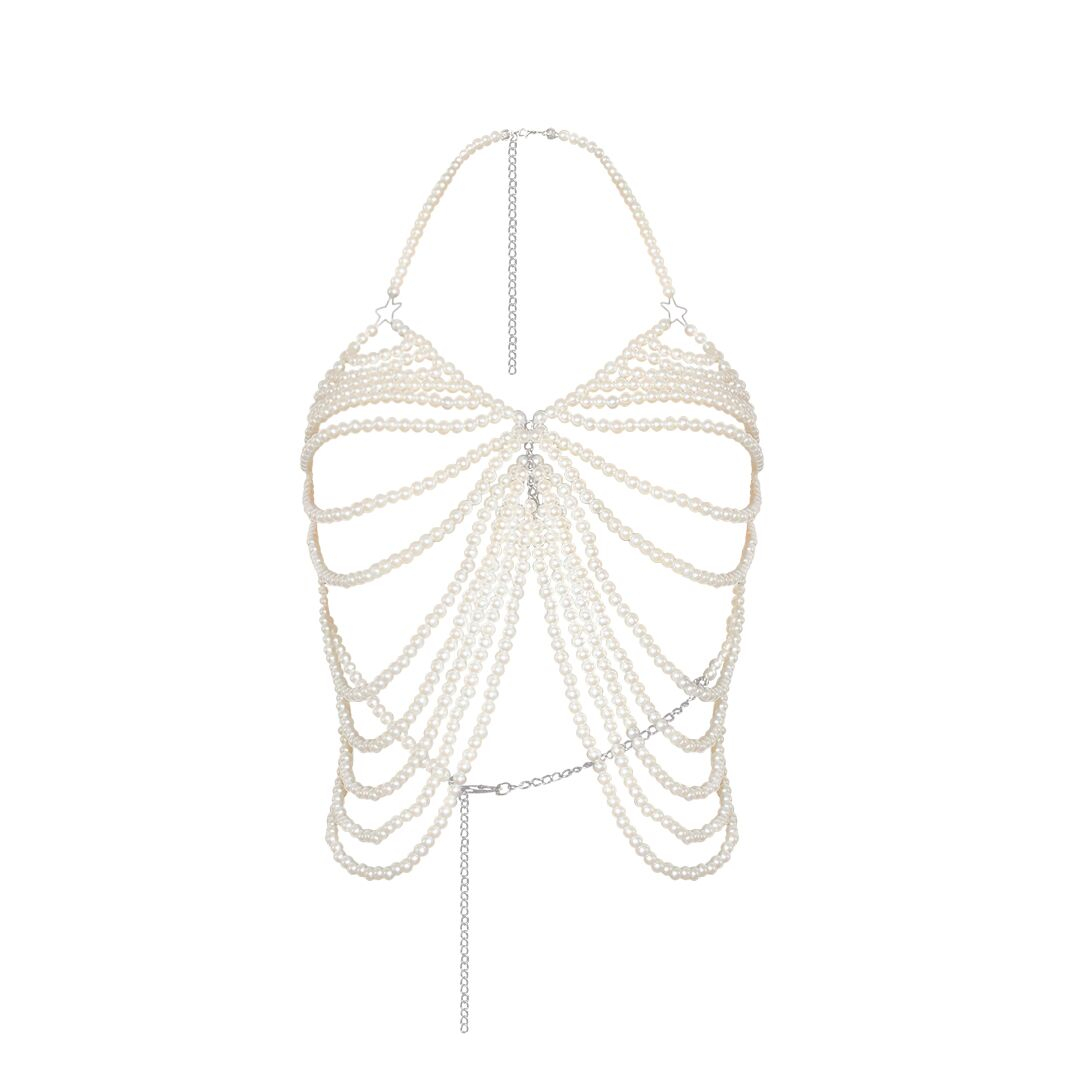 Намисто із штучних перлин Art of Sex - Star - вишуканий і спокусливий аксесуар, який додасть образу витонченості та розкоші. Ніжні перлинні нитки елегантно облягають тіло, створюючи неповторний ефект. Намисто має унікальний дизайн, завдяки чому нагадує топ. Завдяки цьому, його легко можна комбінувати з боді, комплектами нижньої білизни чи рольовими костюмами. Також це намисто може стати сміливим акцентом у вечірньому вбранні. Універсальний і елегантний, цей аксесуар підкреслить вашу жіночність і додасть образу нотку ніжності та загадковості.