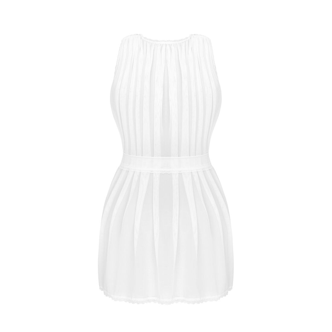Напівпрозорий пеньюар Obsessive Heavenlly peignoir пошито з найтоншого легенького матеріалу, який лише злегка прикриває тіло, лягаючи м'якими хвилястими складками й пестячи шкіру. Пеньюар виконаний у вигляді мініхалатика з поясом і без рукавів. Поли пеньюара облямовані тонким і широким мереживом у дрібну симпатичну квіточку, що додає білизні ніжності та витонченості. Поясок підкреслює талію і не дає неслухняним полам пеньюара оголювати спокусливі частини тіла.