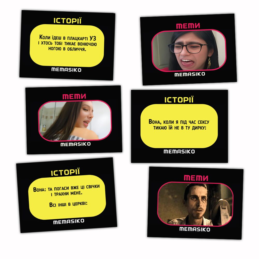 Розважальна гра про меми на різну тематику без цензури. Картки поділені на дві категорії: меми та смішні історії. Завдання гравців — дібрати найсмішніші комбінації та весело провести час. Теми історій і меми дібрані найбільш актуально та пов’язані із сучасними реаліями.