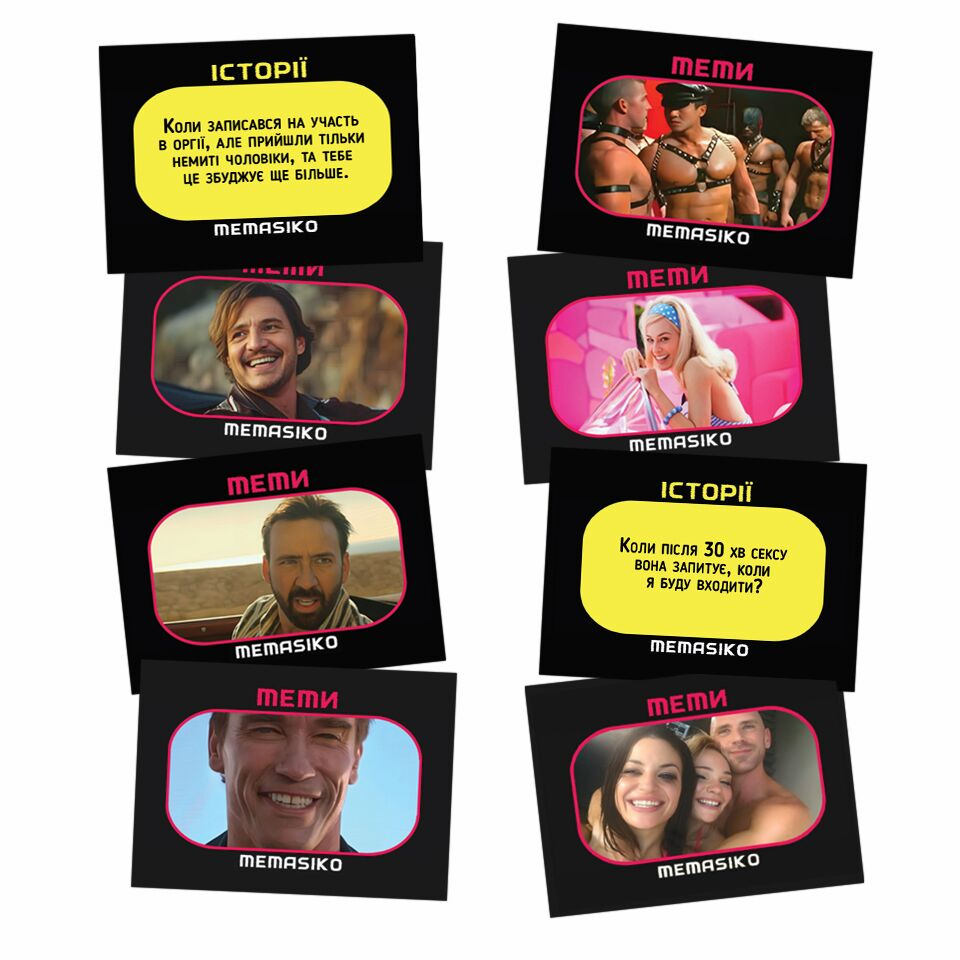 7. Гра може продовжуватися до моменту використання всіх карток з історіями. Картки мемів можна повторно використовувати, перемішавши використані меми.