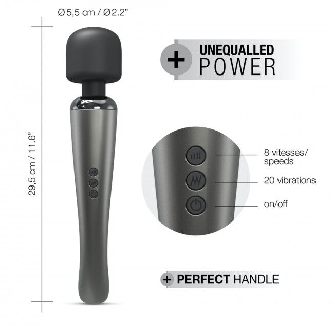 Елегантний і потужний вібромасажер Dorcel Megawand Chrome Silver який перезаряджається, 160 режимів - це 160 варіантів інтенсивної стимуляції тіла та ваших ерогенних зон. Зняти напругу в кінці робочого дня з втомлених м'язів? Позбутися болю в спині? Просто зробити собі приємно ніжними дотиками до шкіри та тіла. Вібромасажер легко впорається із цими завданнями завдяки великій силіконовій голівці, 20 режимам вібрації та 8 рівням інтенсивності. Сильні потоки вібрації дозволять вам максимально розслабитися від відчуття інтенсивного масажу або насолодитися хвилями приголомшливого кліторального оргазму. Вібромасажер повністю водонепроникний, тому ви легко можете поєднувати водні процедури з масажем або кліторальною стимуляцією. Керування здійснюється за допомогою трьох кнопок на корпусі: одна кнопка – увімкнення/вимкнення; друга - перемикає режими вібрації; третя – перемикає рівні інтенсивності.