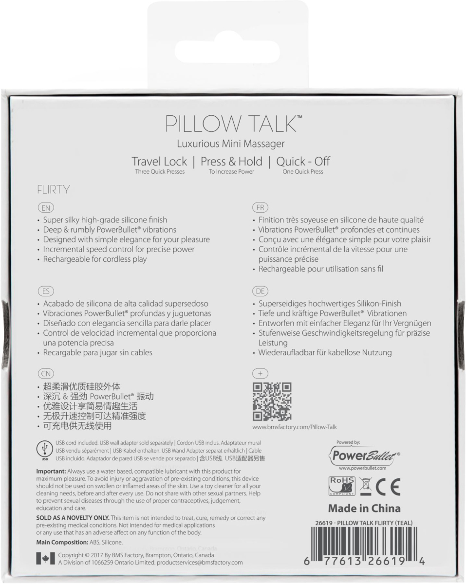 Кожна деталь Flirty створювалася з урахуванням потреб і бажань жінки, тому він - досконалість серед міні-вібраторів. Поставляється у дорогий щільній коробці з оглядовим віконечком, яка може послужити і подарунковим упакуванням.