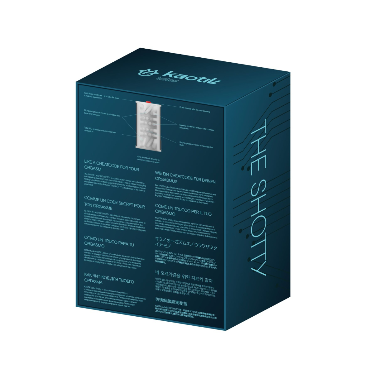 Смарт-мастурбатор Kaotik Labs The Shotty поєднує відразу декілька типів стимуляції: обертання, поступальні рухи та вібрацію, створюючи динамічні та насичені відчуття. Компактний корпус, продумана ергономіка та керування через застосунок перетворюють звичайний соло-процес на незабутній інтерактивний досвід.