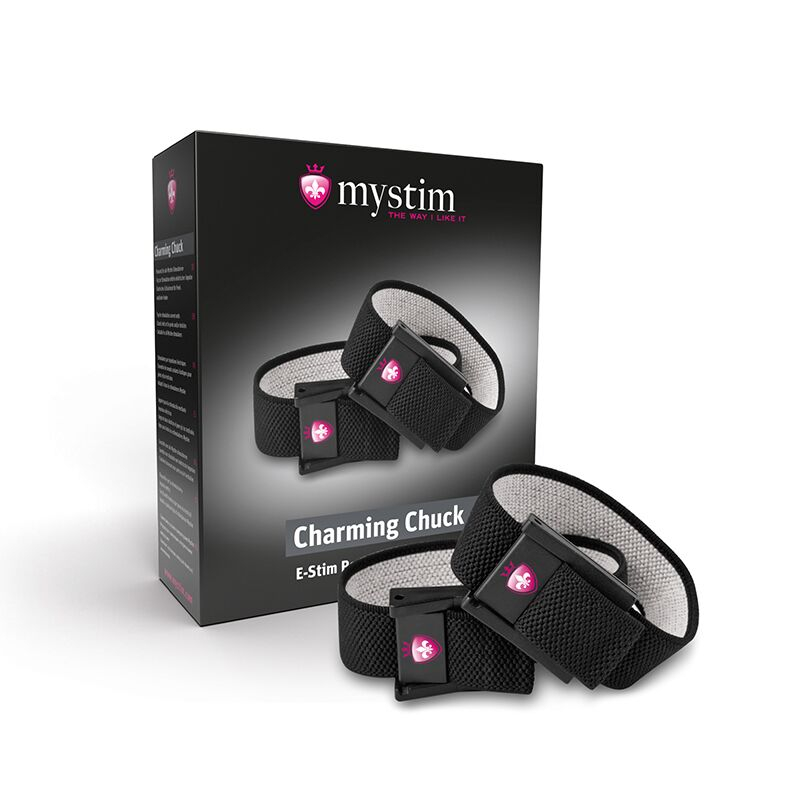 Утяжка для пеніса Mystim Charming Chuck має 2 ременя для кріплення на будь-якому місці пеніса або на яєчках. Ремені регулюються, так що ідеально підійдуть на будь-який розмір і дозволять, як м'яко зафіксувати член і яєчка, так і мати значний тиск. Посилити ерекцію, затримати момент еякуляції - це все зрозуміло, але ця затяжка абсолютно особлива, так як до петель приєднуються електроди для електричного впливу на член.