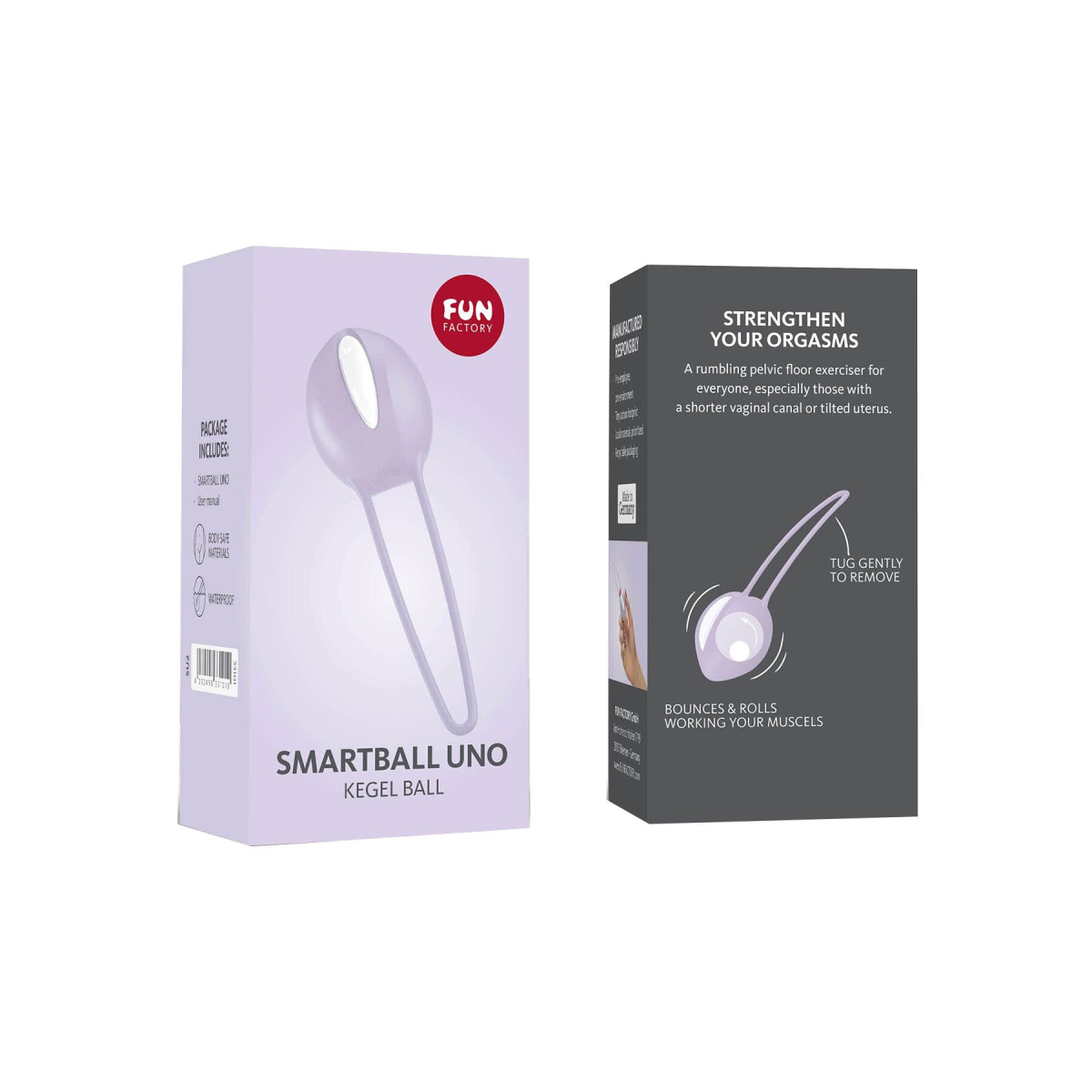 Основа Fun Factory SMARTBALL UNO виконана з медичного силікону з оксамитовою поверхнею. Всередину поміщена обтяжена кулька, яка перекочується під час кожного руху, підтримуючи інтимні м’язи в тонусі. А вставки з гіпоалергенного пластику з боків кульки посилюють приємні відчуття від перекочування.