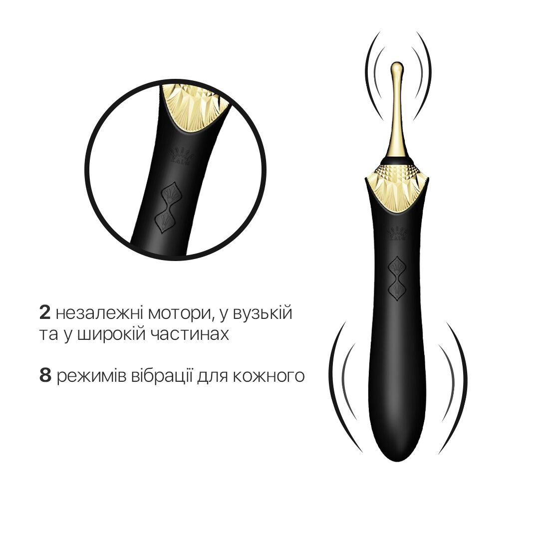 • незвичайна форма: тонка частина для точкової стимуляції клітора — з одного боку, і ширша, схожа на класичний вібратор — з іншого;