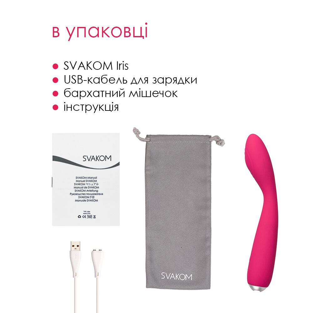 У пакованні: SVAKOM Iris + оксамитовий мішечок + інструкція + USB-кабель для заряджання.
