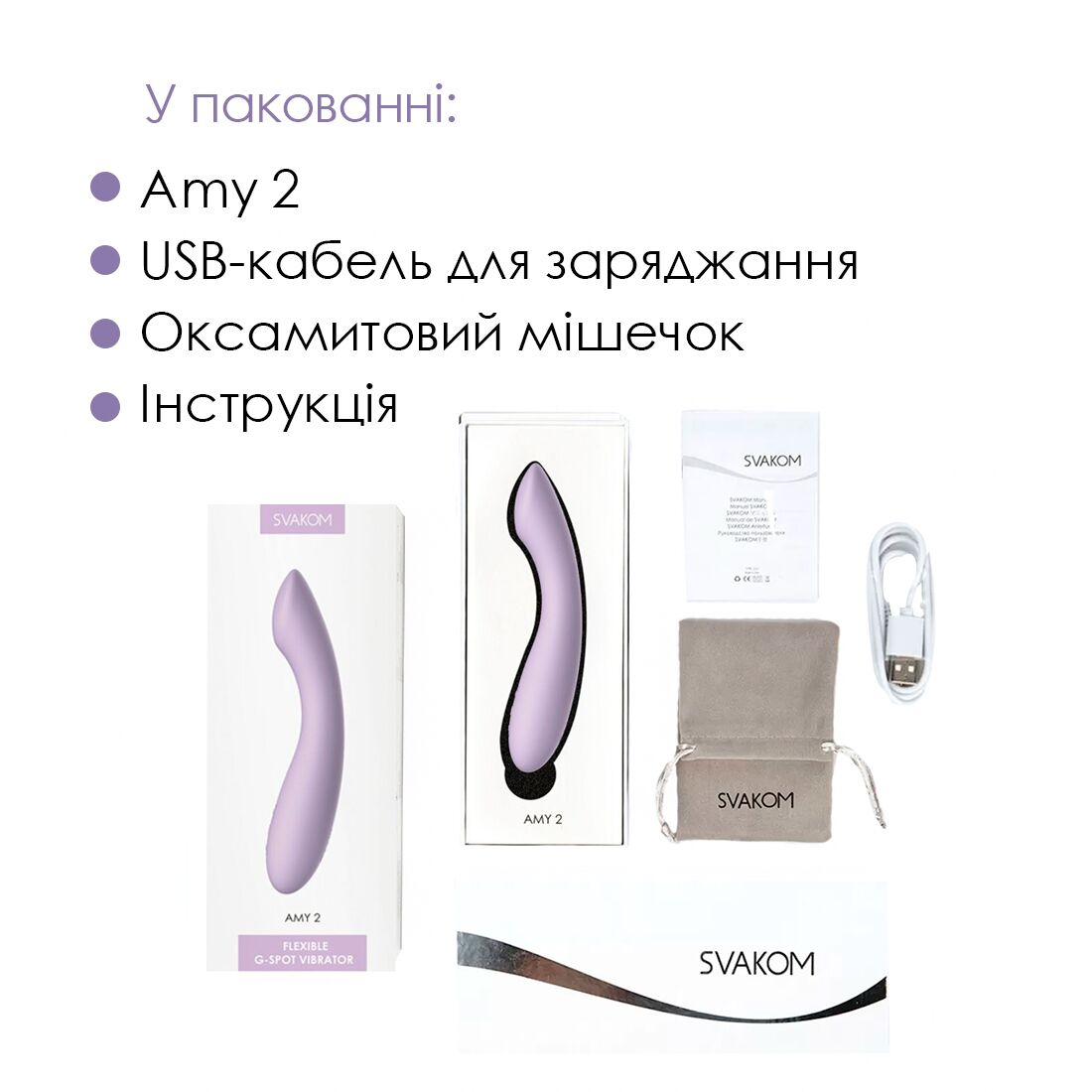 У пакованні: Svakom Amy 2, оксамитовий мішечок, інструкція, USB-кабель для заряджання.
