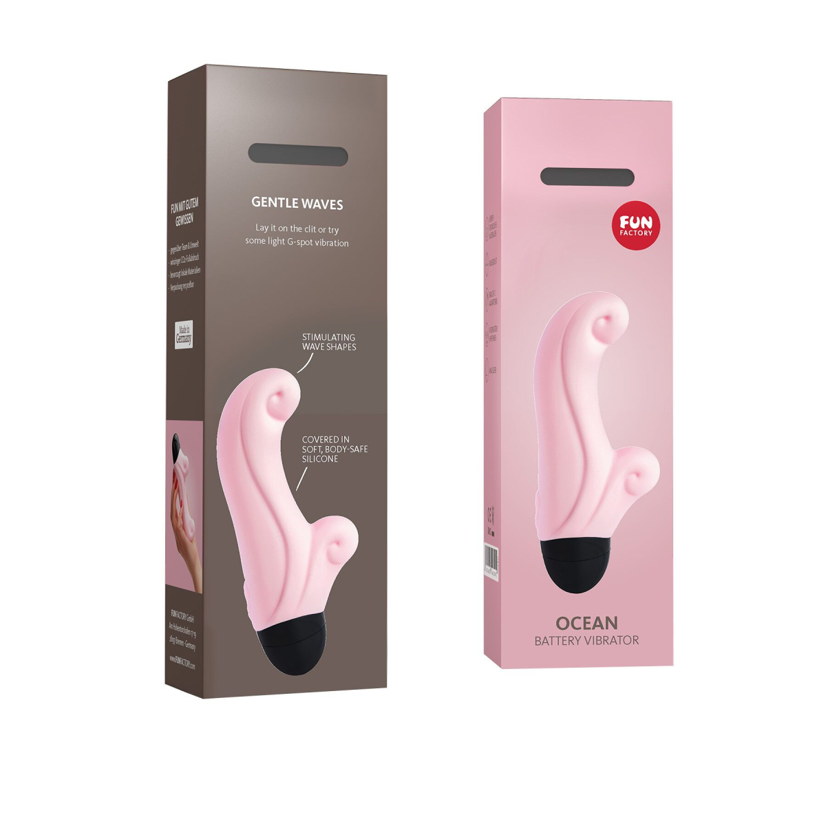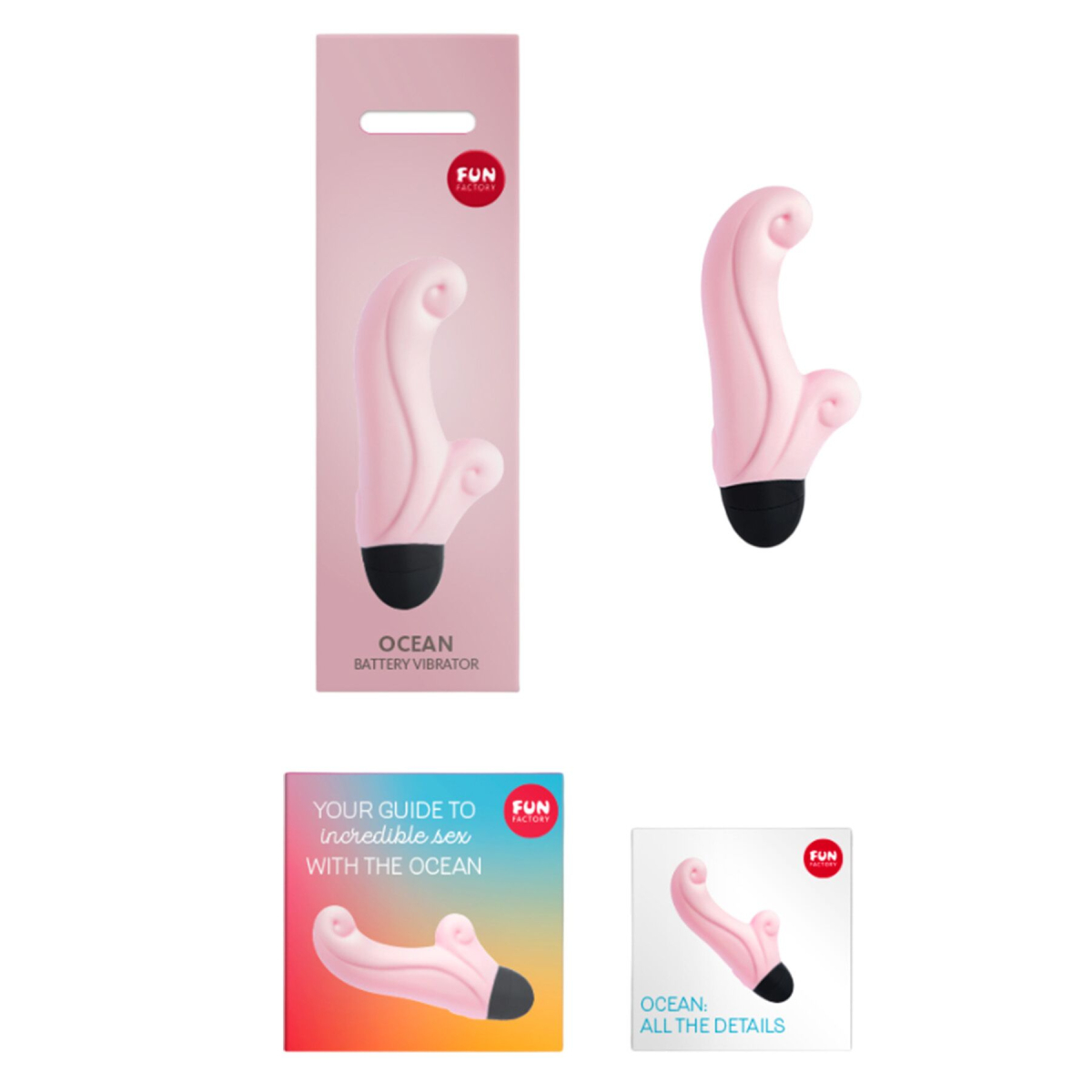 Робоча частина вібратора-кролика Fun Factory OCEAN зроблена з оксамитового на дотик медичного силікону. Дизайн іграшки зачаровує: рельєф на корпусі виконаний у вигляді морських хвиль, а кінчики двох відростків різної довжини заокруглені, немов пінні «баранчики». Ці елементи не тільки мають естетичний вигляд, але й забезпечують яскраву стимуляцію ерогенних зон: ви можете вибирати із 6 швидкостей та 6 режимів вібрації.