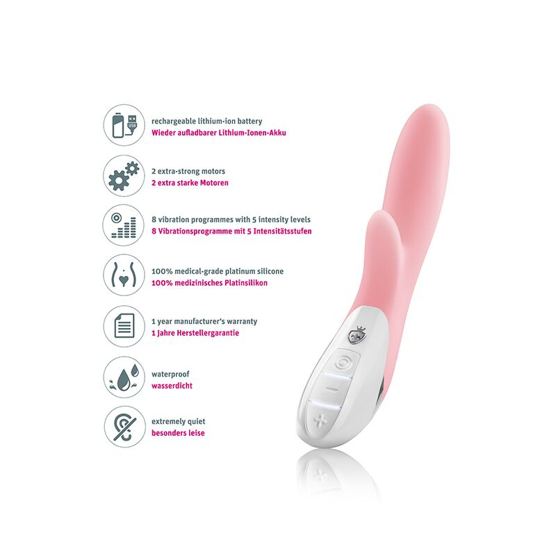 Акуратний вібратор невеликого діаметра завжди готовий вас розважити! Обирайте те, чого бажаєте саме зараз: хтивого задоволення, розтягнутого на години, або потужного вибухового оргазму. Два двигуни - в робочій частині і у відростку - працюватимуть по черзі або одночасно в 8 захоплюючих програмах вібрації та 5 варіантах інтенсивності. Робота вібратора потужна, але абсолютно тиха: вас нічого не видасть, крім стогону насолоди…