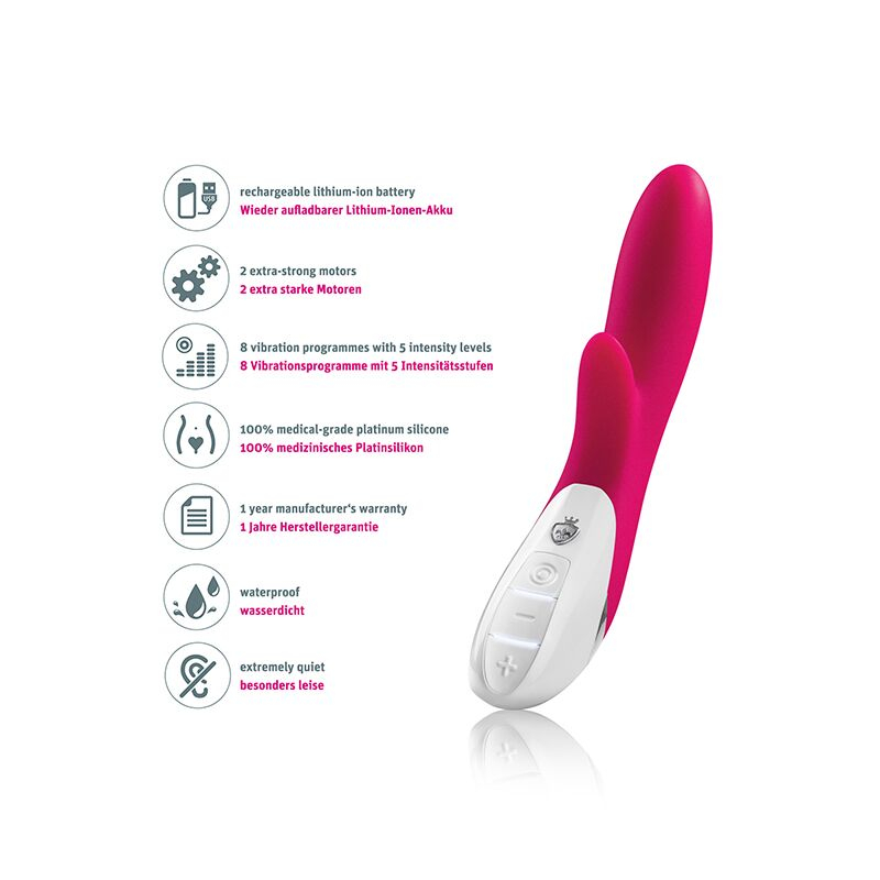 Акуратний вібратор невеликого діаметра завжди готовий вас розважити! Обирайте те, чого бажаєте саме зараз: хтивого задоволення, розтягнутого на години, або потужного вибухового оргазму. Два двигуни - в робочій частині і у відростку - працюватимуть по черзі або одночасно в 8 захоплюючих програмах вібрації та 5 варіантах інтенсивності. Робота вібратора потужна, але абсолютно тиха: вас нічого не видасть, крім стогону насолоди…
