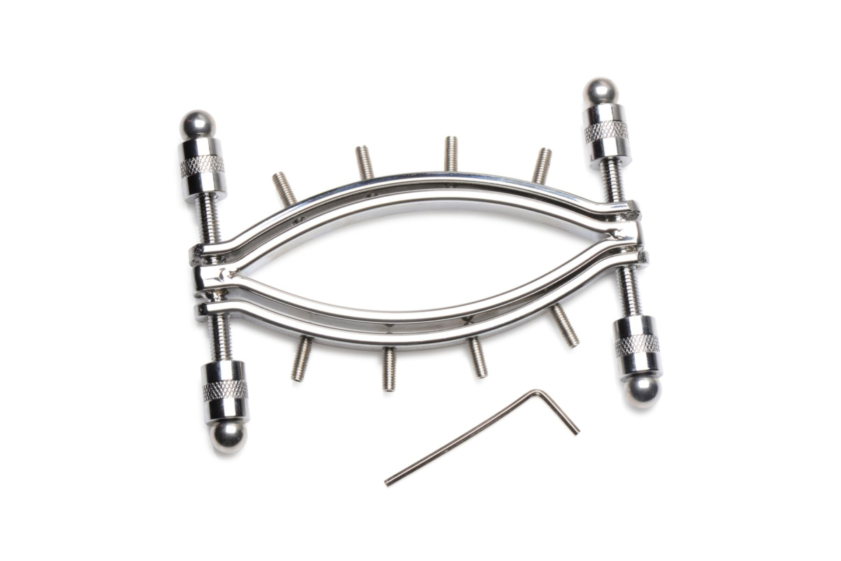 Затискач для вагіни Master Series: Spread 'Em Poker Vagina Clamp with Adjustable Pressure Screws з шипами ідеально підійде для температурних ігор. Опустіть затискач у прохолодну або теплу воду перед використанням та спостерігайте, як реагуватиме на різні варіанти стимулювання ваш партнер.