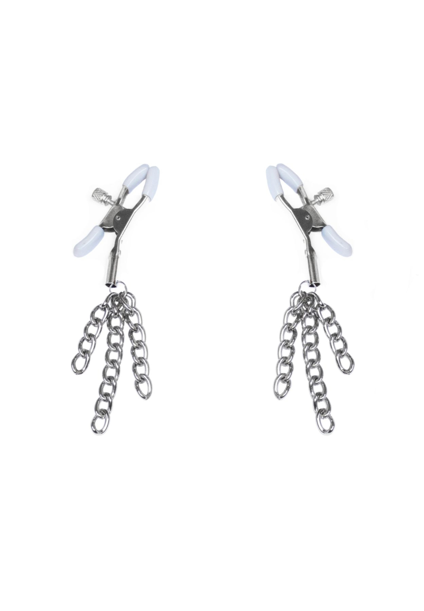 Привабливі затискачі з трьома "пензликами" - ланцюжками і чорно-білими деталями будуть не тільки розкішно виглядати на грудях, але і подарують незабутні відчуття.