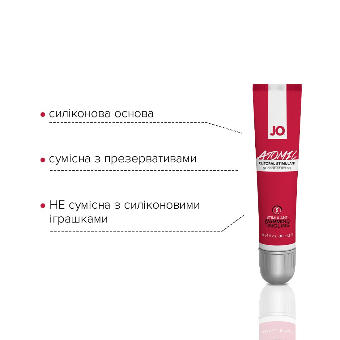 Збудливий гель для клітора JO ATOMIC WARMING (10 мл) — це засіб на основі силікону, призначений для стимуляції клітора; посилює чуттєве задоволення, створюючи збудливий зігрівальний ефект під час місцевого використання. Призначений для створення яскравих тактильних відчуттів та підвищення чутливості під час прелюдії та самостійних пестощів.